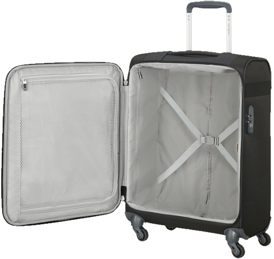 — Corpul este fabricat din poliester durabil, rezistent la abraziune și un cadru din polimer rezistent. Acest design al valizei se dovedește a fi foarte ușor, dar în același timp destul de puternic.