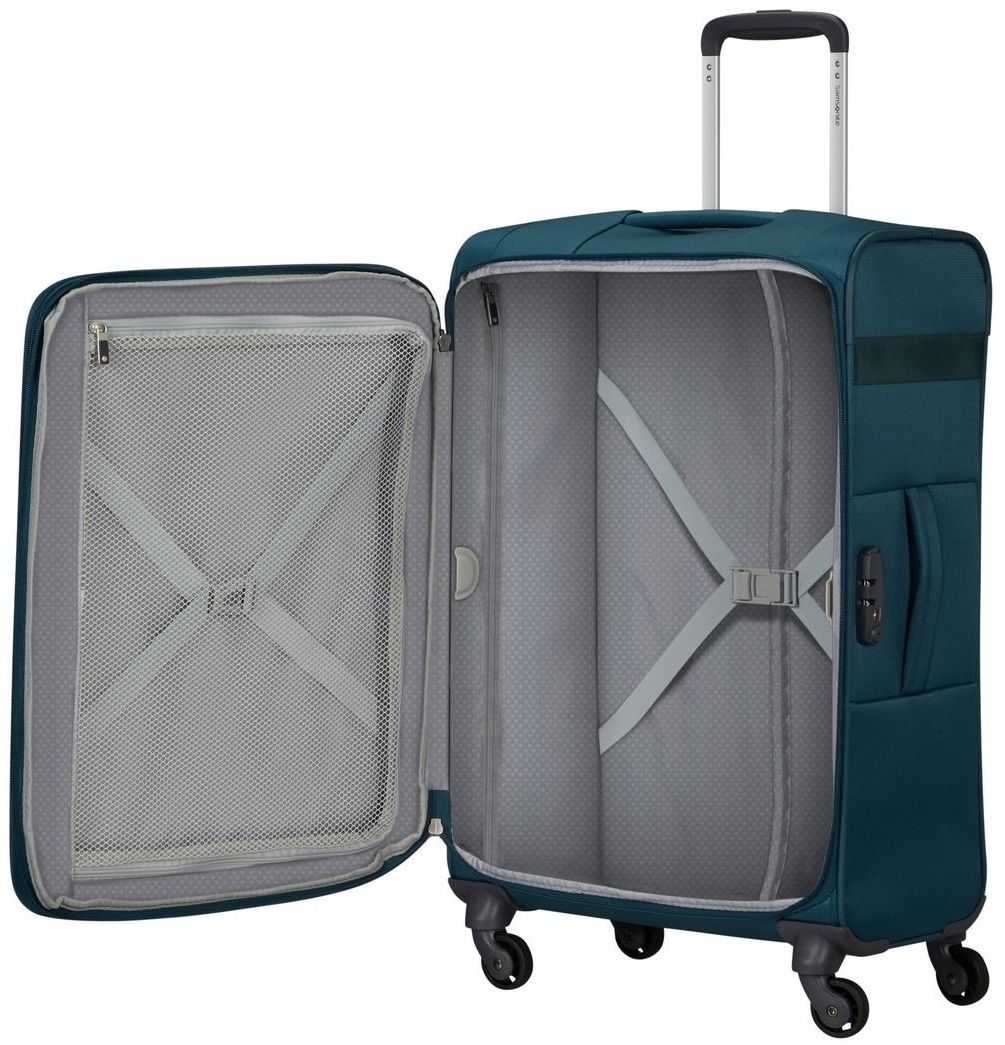 — Corpul este fabricat din poliester durabil, rezistent la abraziune și un cadru din polimer rezistent. Acest design al valizei se dovedește a fi foarte ușor, dar în același timp destul de puternic.