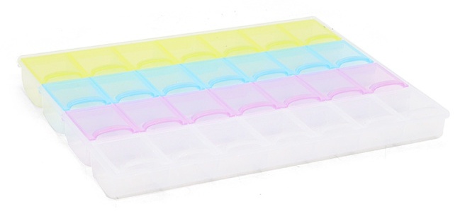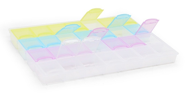 Fără îndoială - este nevoie de multă muncă și răbdare pentru a crea lucrări folosind tehnica mozaic cu diamante. Acesta este un hobby pentru oamenii atenți și meticuloși. Cu toate acestea, oricare dintre cunoscătorii lucru de mână se confruntă cu problema stocării strasurilor și mărgelelor. Fie se amestecă împreună în organizator, fie este dificil să obții ultimele pietre din colțul compartimentului. Acest organizator vă va rezolva toate problemele. Fiecare celulă are un capac separat, sigilat. Organizatorul este fabricat din plastic durabil, transparent, astfel încât să puteți vedea întotdeauna conținutul acestuia. Cumpărați o singură dată - vă va facilita și eficientiza pentru totdeauna lucrul cu ace.