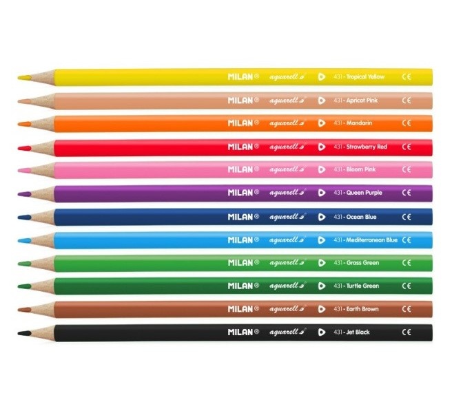 Un set de creioane triunghiulare Milan pentru acuarelă. Minele creioanelor se transformă în vopsea acuarelă la contactul cu apa. Creioanele au mine moi, dar rezistente la rupere.