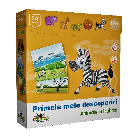 Acest set contine cartonase formate din cate 2 piese pe care trebuie sa le imbini corect: pe piesa din dreapta este ilustrat un peisaj natural, iar pe piesa din stanga este ilustrat un animalut care traieste in mediul respectiv.