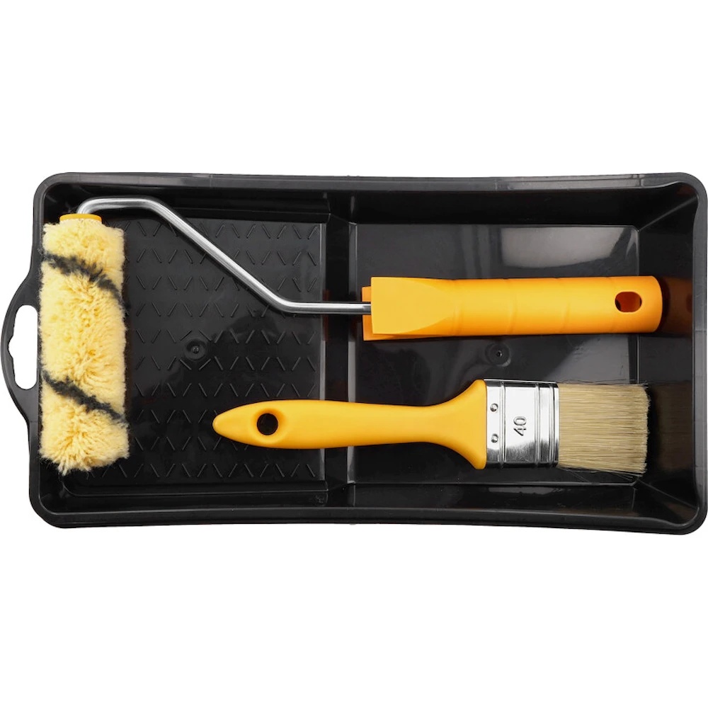 Setul include o cadă din plastic negru, cu dimensiunile de 290×150 mm, prevăzută cu o zonă în relief pentru îndepărtarea surplusului de vopsea de pe rolă, o rolă de 100 mm și o pensulă de 40 mm pentru vopsirea precisă a colțurilor și detaliilor. Mânerul, cu diametrul tijei de 6 mm, este ergonomic și permite schimbarea rapidă a uneltelor.