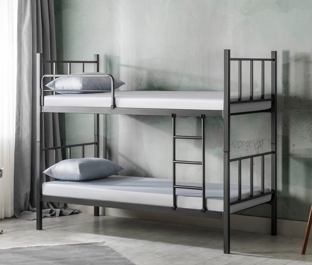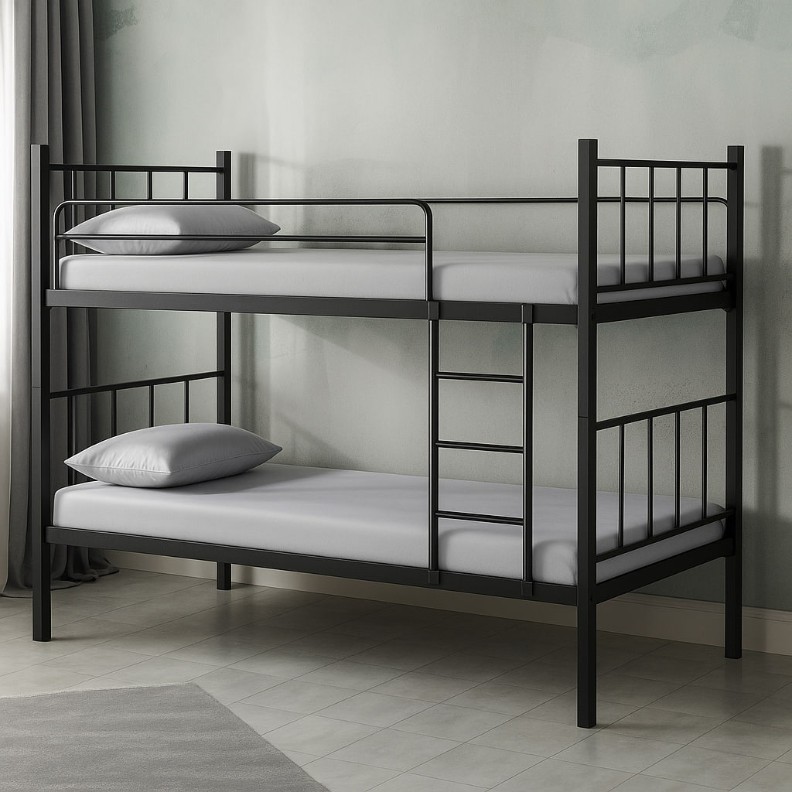 Patul etajat Evger R-90 este o soluție practică pentru camera copiilor sau spații restrânse. Structura este realizată din metal, oferind rezistență și durabilitate în timp. În pachet este inclus cadrul metalic (baza), deci nu este necesar să achiziționezi separat suportul. Patul este echipat cu balustrade de protecție și o scară, pentru utilizare confortabilă și sigură. Se livrează fără saltele, oferindu-ți libertatea de a le alege după preferință și nivel de confort.