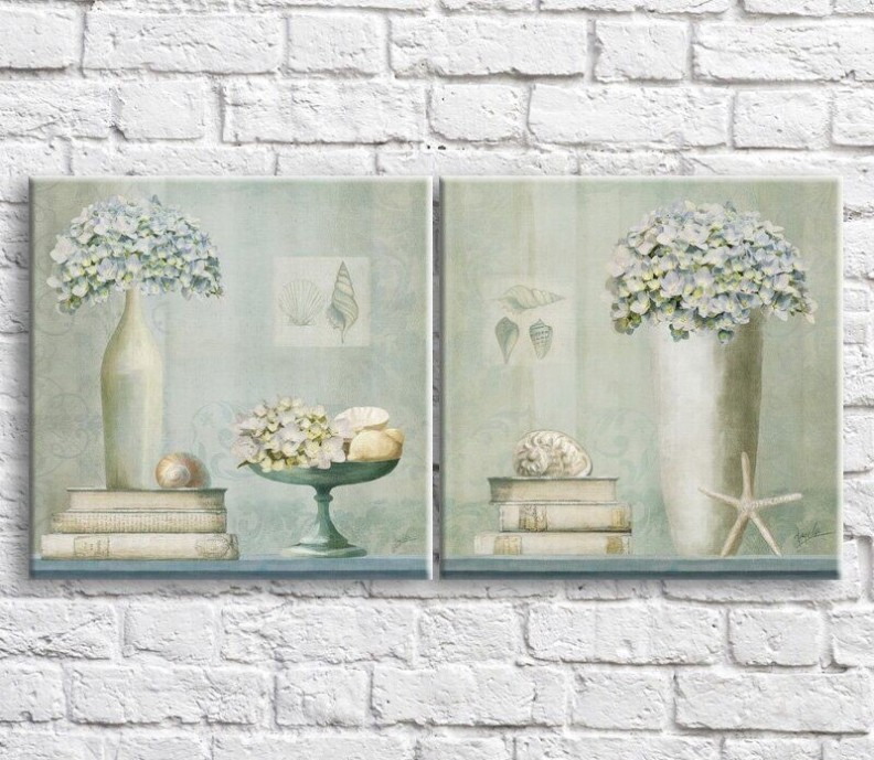 Pictură ArtPoster White flowers in a vase and shells, still life, diptych (3467683)
