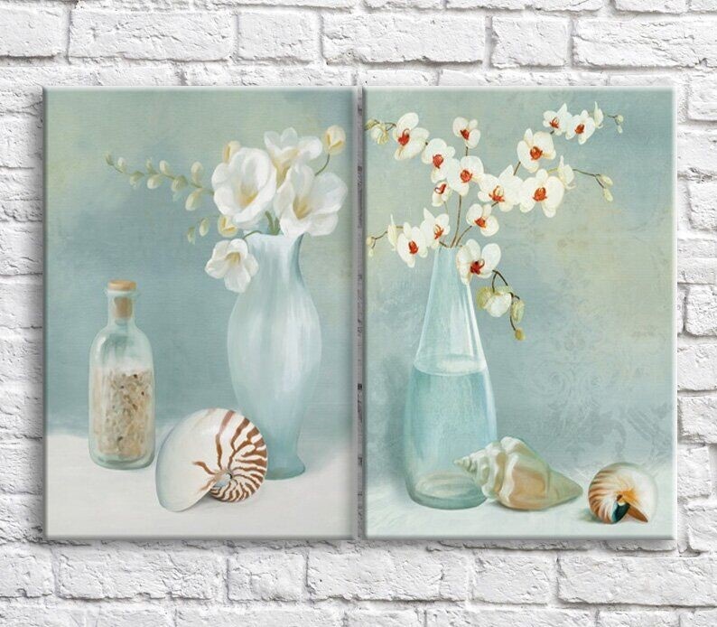Pictură ArtPoster White flowers in vases and seashells on a Pale/Blue background (3467842)