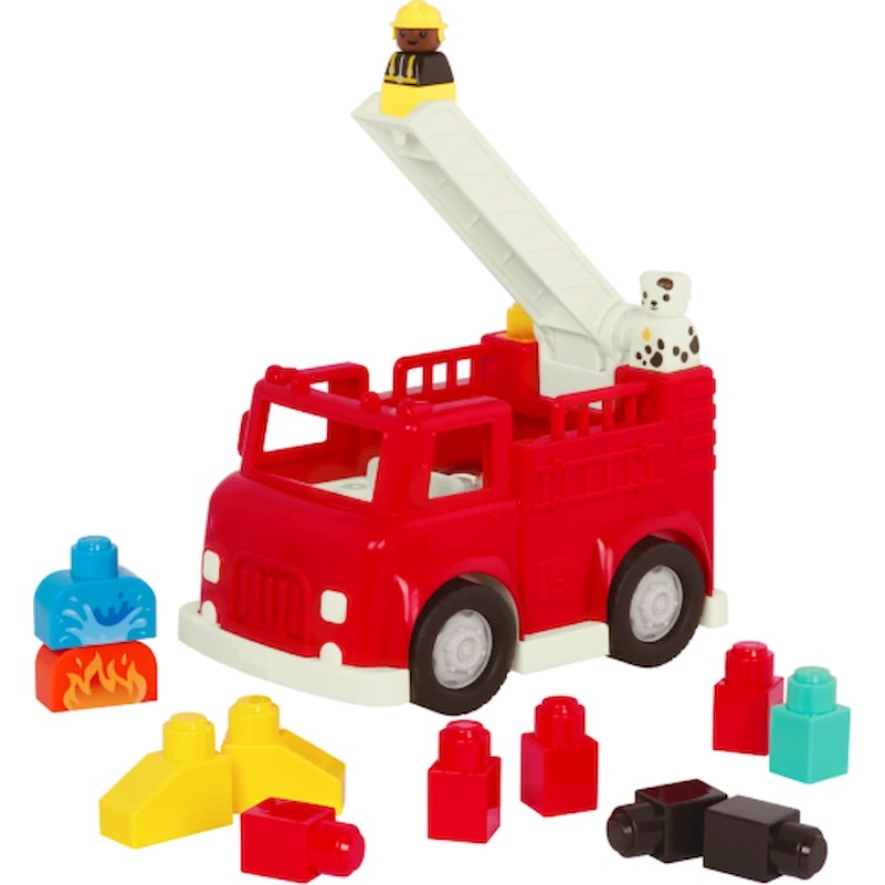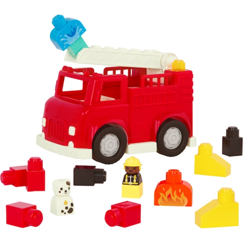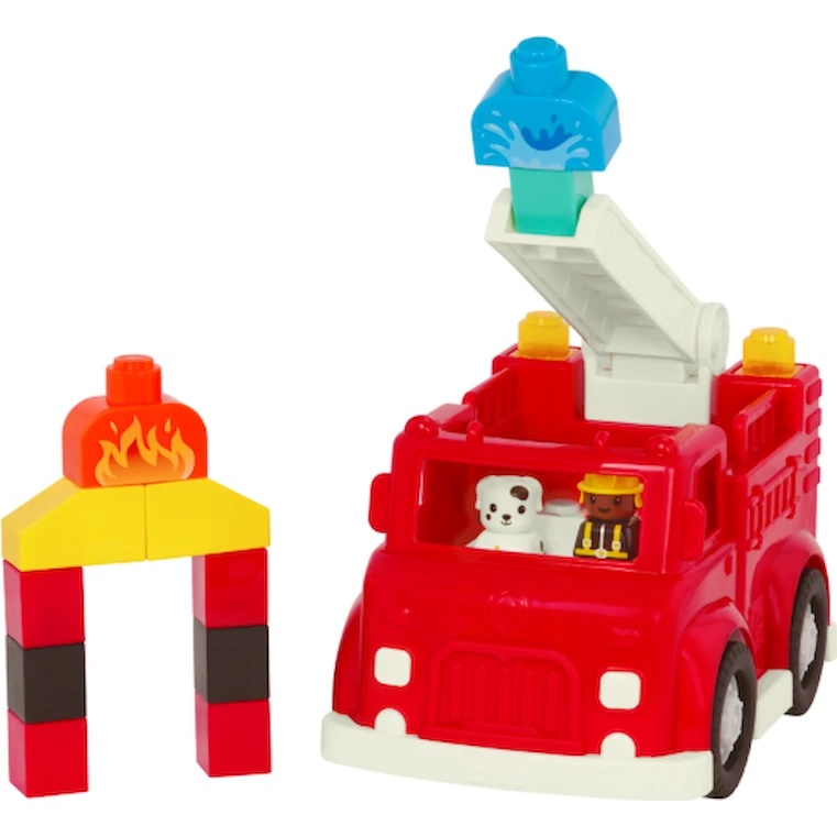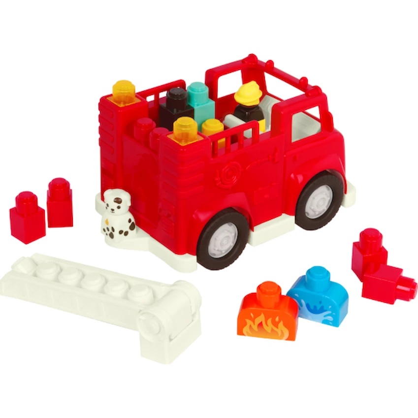 Setul include o mașină de pompieri colorată cu scară detașabilă, 13 blocuri de construcție mari și două personaje fermecătoare: un pompier curajos și câinele său loial. Acest constructor funcțional va fi primul cadou ideal pentru copil, oferind posibilități nelimitate pentru jocuri de rol și primele descoperiri inginerești.
