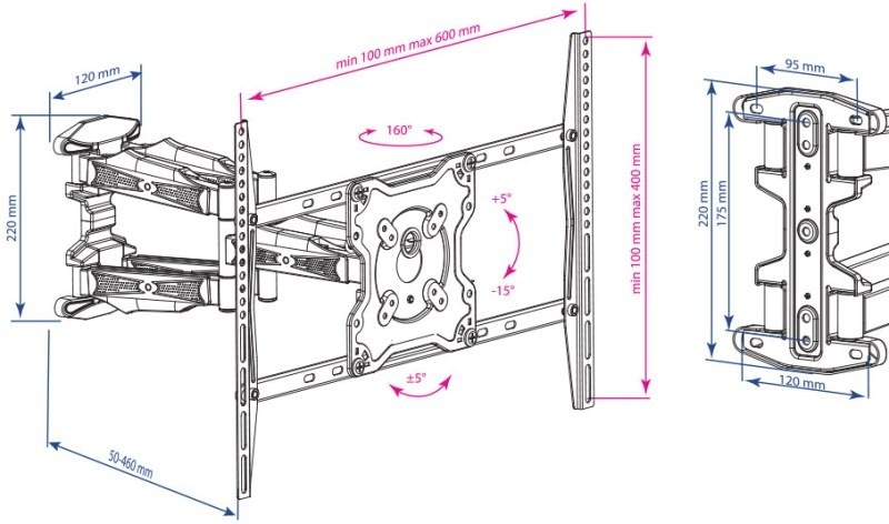 Standard VESA100x100, 200x100, 200x200, 300x200, 200x300, 300x300, 200x400, 400x200, 400x300, 400x400, 600x200, 600x300, 600x400 mm