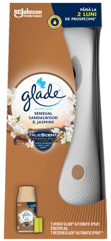 Glade Automatic Spray ofera un parfum incantator saptamana dupa saptamana, in mod automat, fiind perfect pentru camerele mai mari ale casei. Pentru a regla intensitatea parfumului se poate selecta timpul de pulverizare (9, 18, 36). Astfel produsul elibereaza automat valuri delicate de parfum timp de pana la 60 de zile, folosit la setarea de 36 de minute.