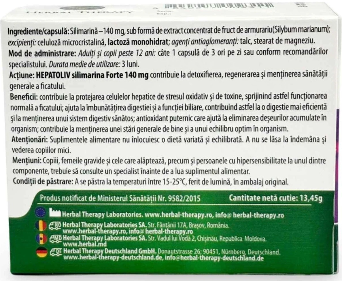 Hepatoliv Silimarina Forte este un supliment natural care susține sănătatea ficatului, oferind un efect de detoxifiere și protecție datorită silibininei din silimarină – un extract puternic de armurariu (ciulin de lapte). Acesta ajută la regenerarea celulelor hepatice și protejează ficatul împotriva factorilor nocivi externi, precum alcoolul și medicamentele. Este ideal pentru curățarea organismului și menținerea funcției optime a ficatului.