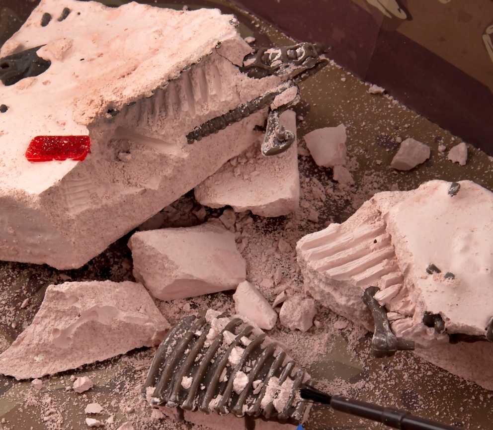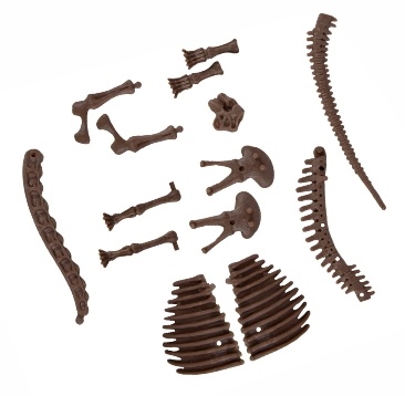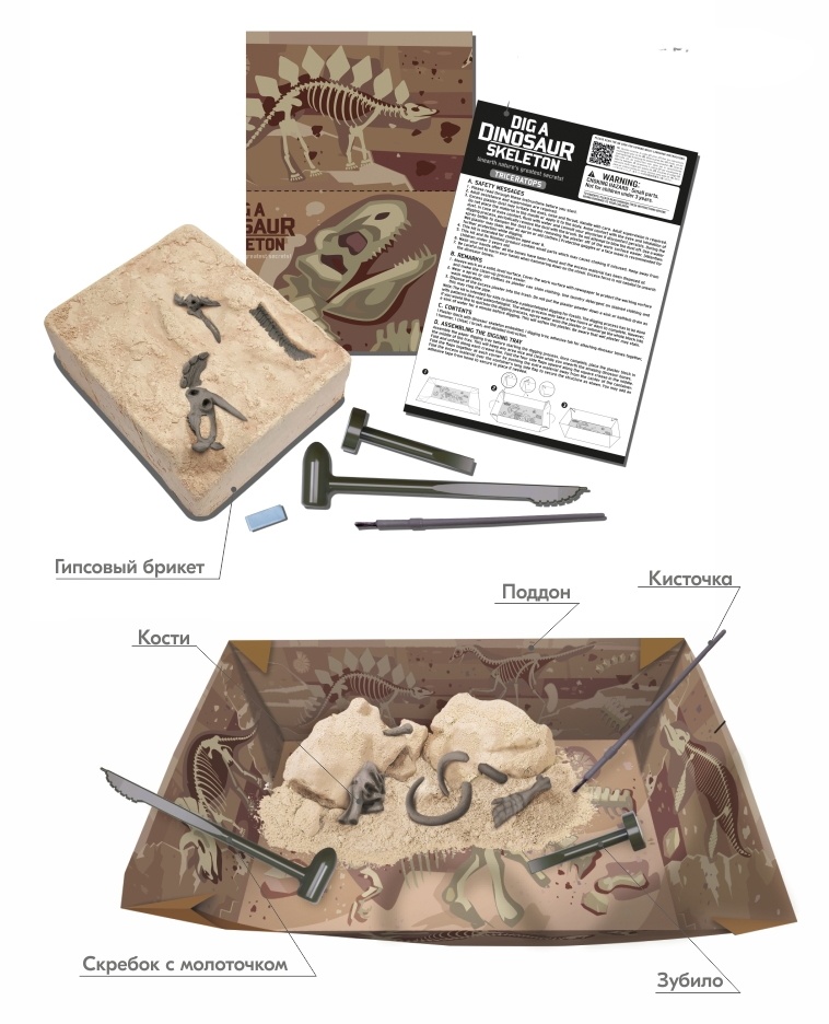 Intră în setbrichetă de ipsos (cu oase de dinozaur în interior), ciocan cu o racleta, daltă, ciucure, ceară moale pentru a conecta oasele scheletului, palet (din hârtie), instrucție