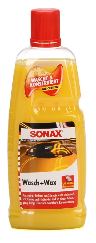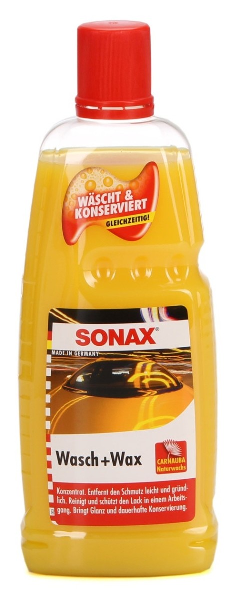 Car shampoo SONAX Wash & Wax (Wasch+Wax) 1L 313341 with wax for quick and effective care of paintwork. Removes all types of dirt and is suitable for all types of paint surfaces, metals, glass, plastic, and rubber parts. It can also be used at home — for cleaning tiles, porcelain, and enameled surfaces.