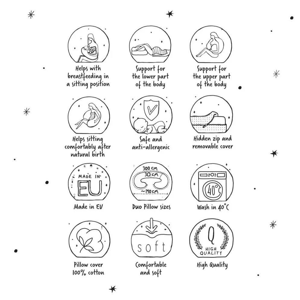 Perna DUO este multifuncțională, destinată femeilor însărcinate și mamelor care alăptează. Inovația sa constă în construcția în două părți și utilizarea a două tipuri diferite de umplutură.