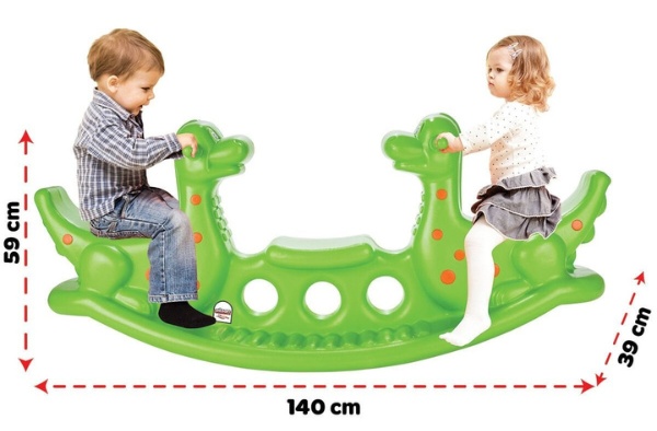 Leagănul dublu Pilsan Dino Seesaw (06-147) are un aspect elegant, o construcție robustă și un design ergonomic. Leagănul este rezistent la orice precipitații, nu se estompează, ușor de curățat. Este suficient să ștergeți leagănul în mod regulat cu o cârpă umedă pentru a îndepărta praful și murdăria, iar leagănul vă va servi mulți mulți ani.