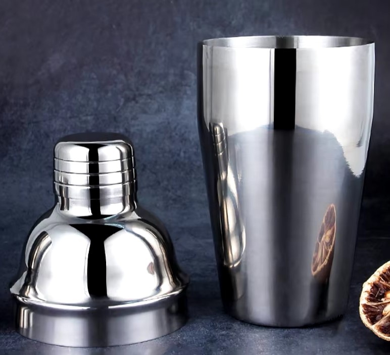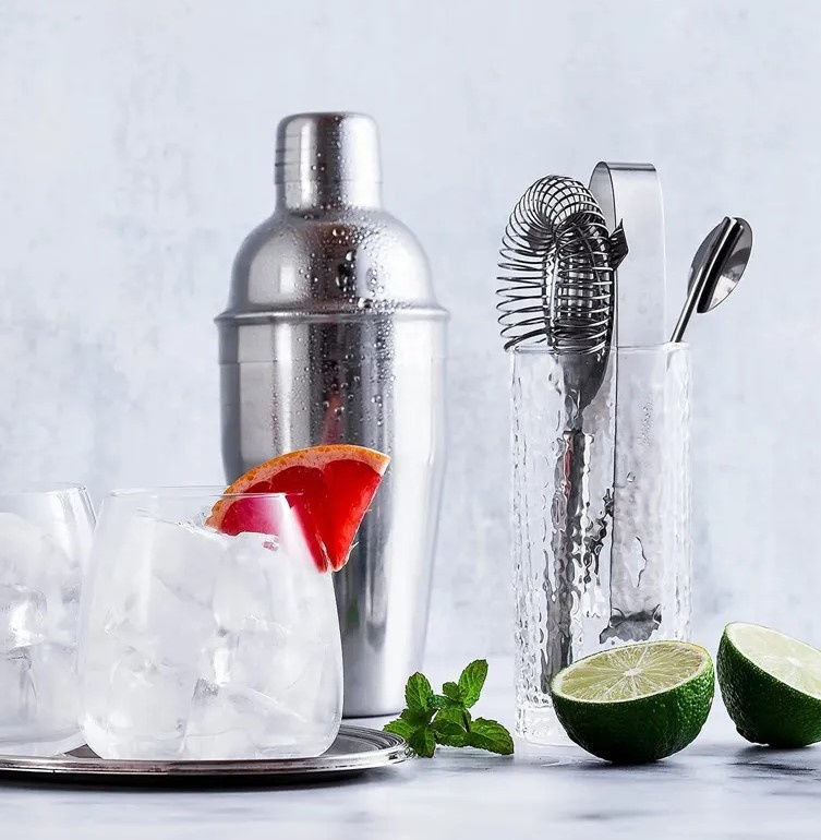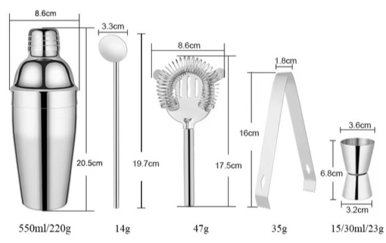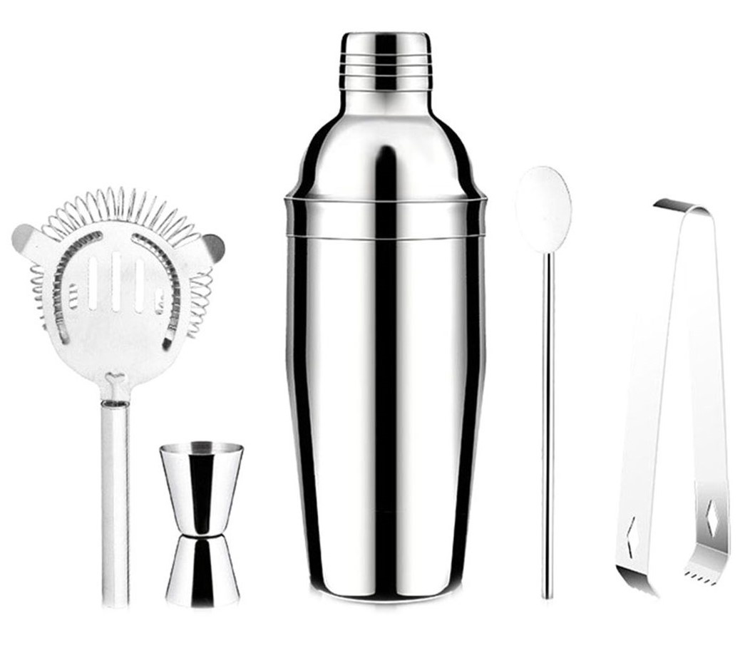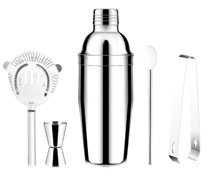 In setshaker, clește pentru gheață, pahar gradat, linguriță de bar, strecurătoare