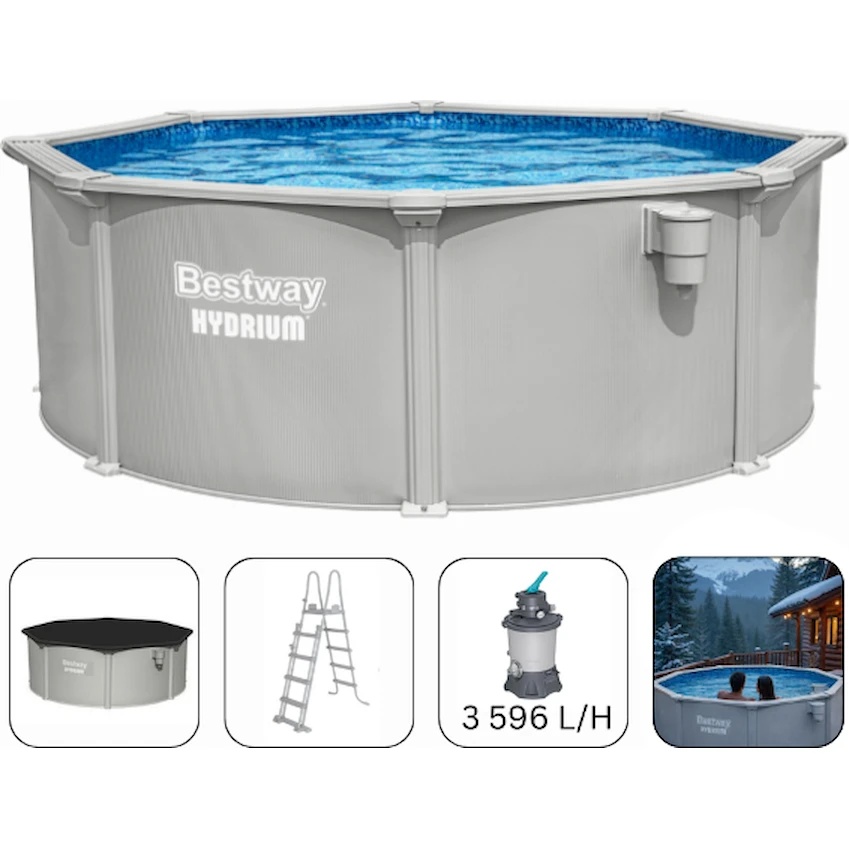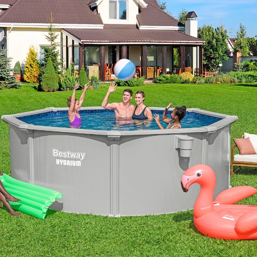 Creează-ți propria zonă de relaxare direct în grădină cu piscina rotundă din oțel Bestway® Hydrium™. Cu un diametru de 366 cm și o înălțime de 122 cm, piscina are un volum de până la 10 990 litri de apă și este ideală pentru relaxarea în familie și înot răcoritor în zilele călduroase.