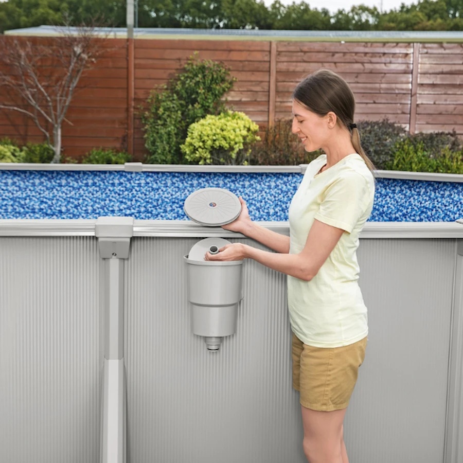 Interiorul piscinei este realizat din PVC de înaltă calitate, cu protecție UV și finisaj decorativ tip pietriș, oferind senzații plăcute la atingere și un aspect elegant. Culoarea gri-granit a pereților exteriori se integrează armonios în orice peisaj, iar marginea foarte largă asigură confort și siguranță în utilizare. Skimmer-ul integrat curăță eficient apa de frunze și impurități.