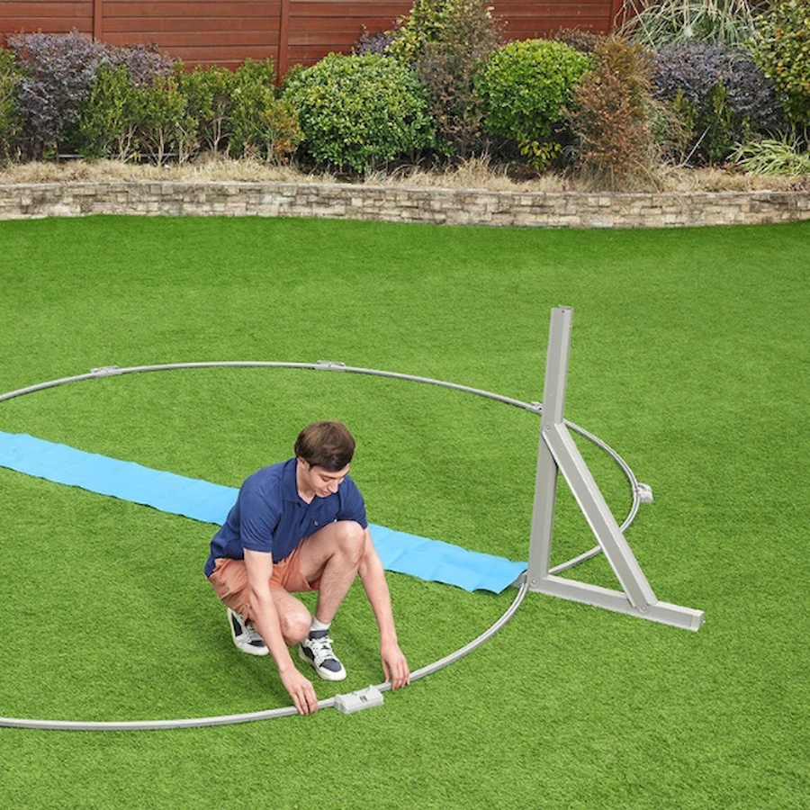 Setul include un sistem puternic de filtrare cu nisip, care menține apa mereu curată. Sistemul poate funcționa atât cu nisip filtrant (8,5 kg), cât și cu bile filtrante eficiente Polysphere™. Accesul sigur în piscină este asigurat de o scară galvanizată. Salteaua protejează fundul piscinei, iar prelată previne pătrunderea murdăriei în apă. Dozatorul ChemConnect® simplifică întreținerea apei, distribuind uniform tabletele de clor. În caz de mici deteriorări, este inclusă o plasture autoadeziv pentru reparații.