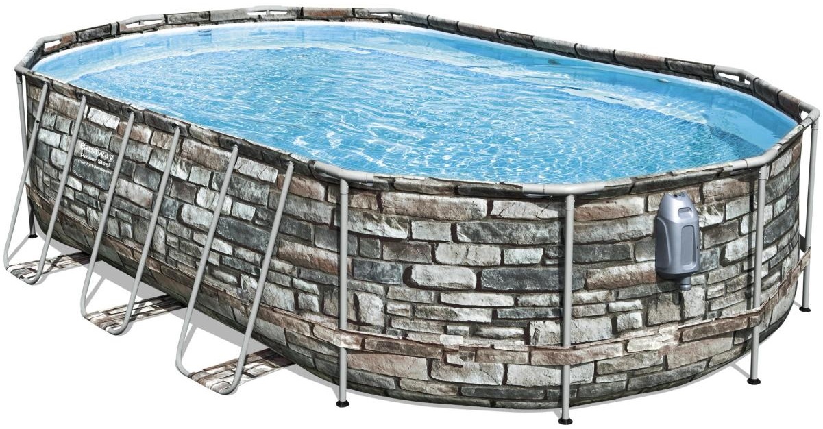 Piscina cu cadru oval Bestway 56719 se remarcă prin culoarea sa originală și configurația unică. Vasul este realizat din PVC cu trei straturi de înaltă calitate: două straturi de vinil dens și între ele o plasă de poliester pentru un plus de rezistență. Culoarea vasului de piscină la exterior imită piatră, suprafața interioară are o colorare mozaic. Cadrul este metalic, acoperit cu un strat de plastic care previne coroziunea.