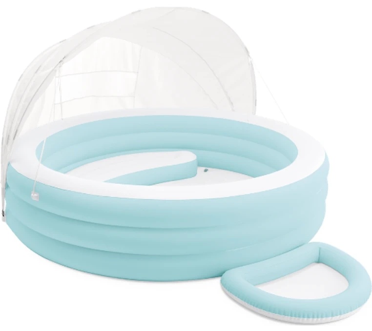 Piscina este dotată cu un scaun gonflabil comod și un acoperiș detașabil cu protecție UV UPF 50+, care oferă umbră plăcută în zilele călduroase. În set este inclusă și o mini cadă gonflabilă pentru picioare, pentru un plus de confort.