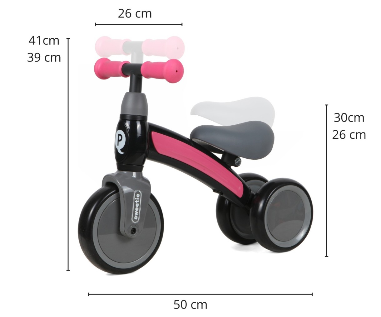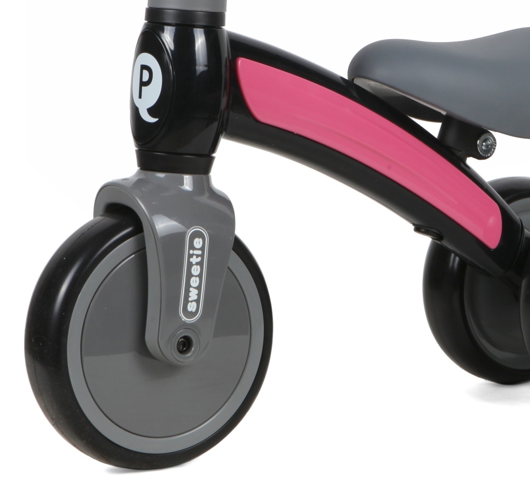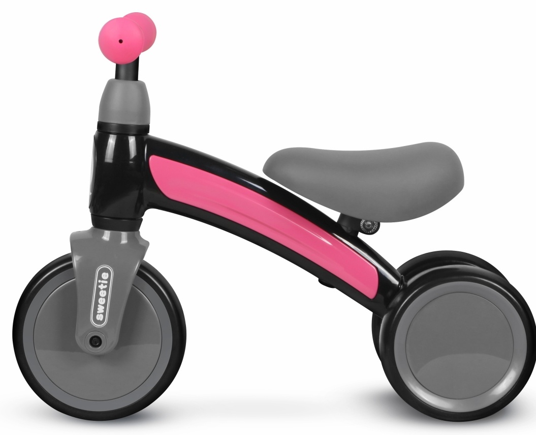 Sweetie are 3 roți duble din spate pentru o stabilitate excepțională, anvelopele din spumă EVA sunt silențioase și permit vehiculului să fie folosit atât în interior, cât și în exterior. Ghidonul și șa reglabile vă permit să reglați mașina la înălțimea copilului. Forma raționalizată reduce rezistența aerului, rezultând viteze de deplasare mai mari. Conform regulilor fizicii, cu cât un vehicul/bicicletă se mișcă mai repede, cu atât îi este mai ușor să se mențină în poziție verticală. Șaua căptușită și profilată și mânerele anti-alunecare oferă confort și ușurință în utilizare.