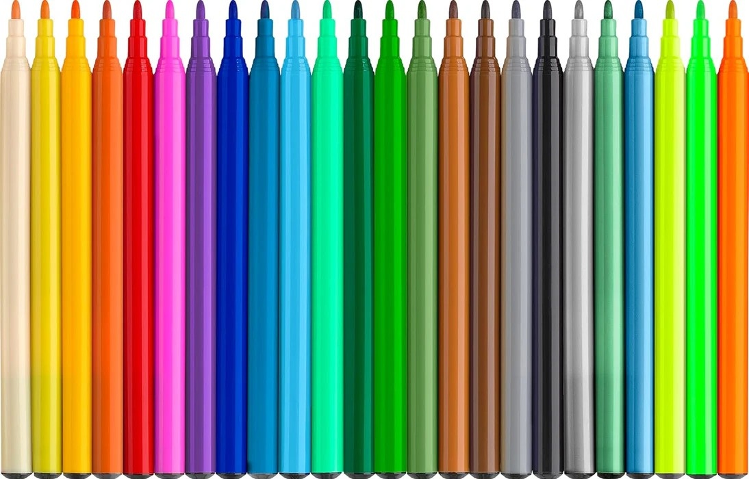 Pixuri cu vârf de fetru „Dinozaur” de la producătorul german Faber-Castell, 18 culori standard + 3 pixuri cu vârf de fetru metalice + 3 pixuri cu vârf de fetru neon + autocolante cu dinozauri, în cutie de carton.