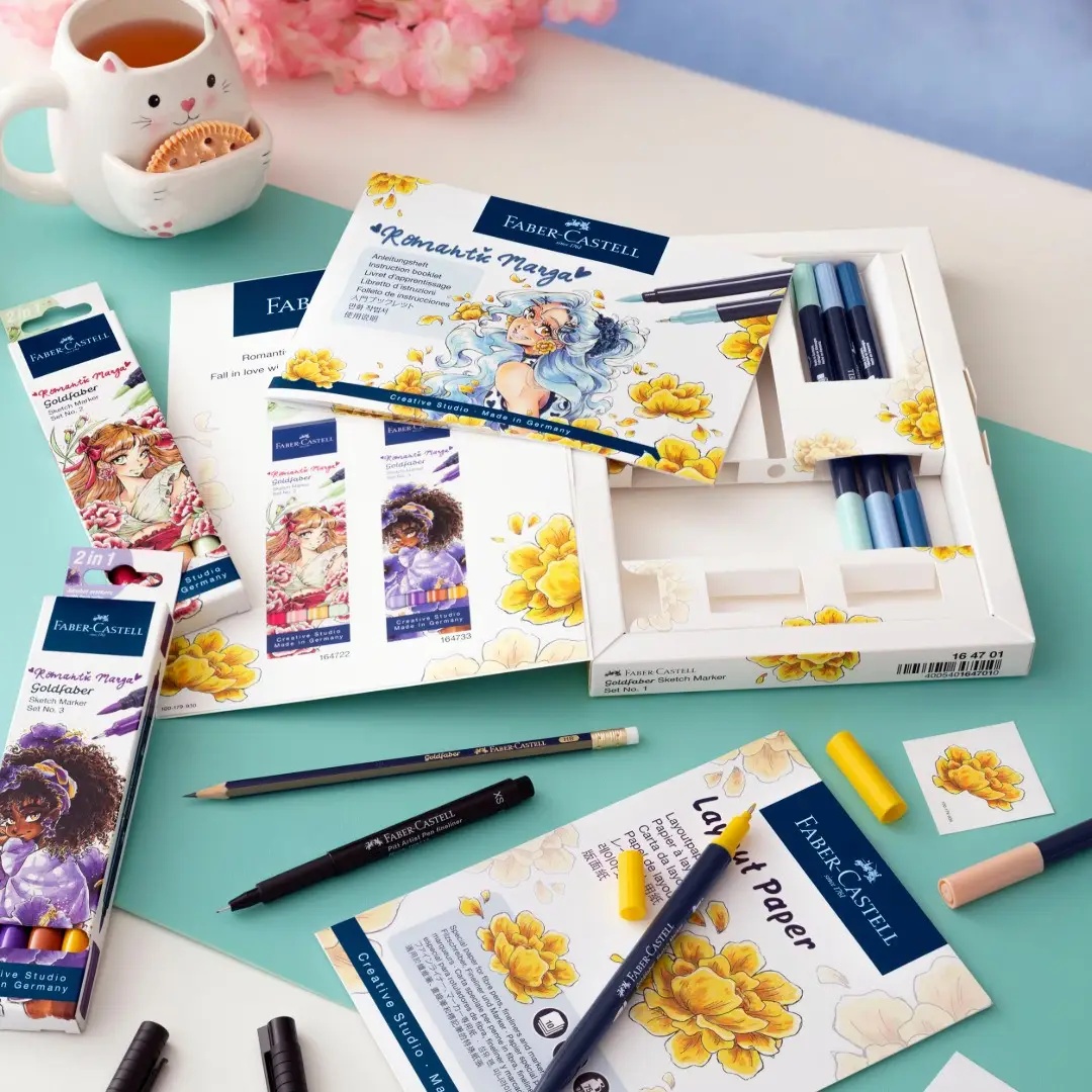 Faber‑Castell Goldfaber Sketch Marker Romantic Manga 1 (164701) este un set artistic creativ pentru desen în stil manga și ilustrații. Kitul conține tot ce ai nevoie pentru a începe să creezi personaje și ilustrații din prima clipă. Cerneala markerelor este pe bază de alcool, se usucă rapid, este rezistentă la apă și la frecare, iar culorile se pot suprapune pentru umbre și profunzime.