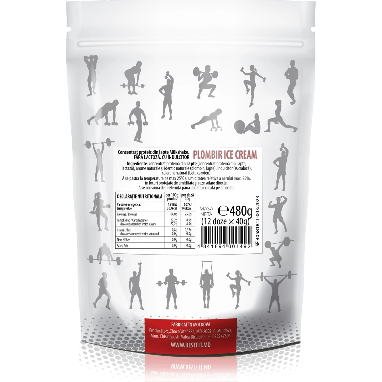 Ingrediente: concentrat de proteine din lapte (concentrat de proteine din lapte, lactază), pudră de cacao 22/28, arome identice naturale: înghețată, lapte, îndulcitor – sucraloză.