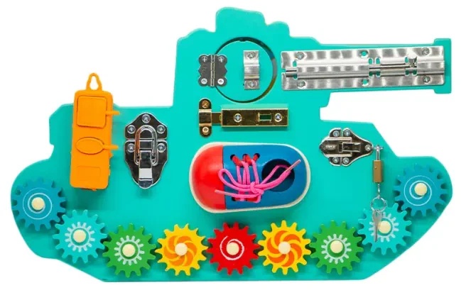 Jucându-se, copilașul tău apucă, deschide/ închide ușile și încuietoarele, rotește fidget-ul, aprinde luminițele, scoate sunete la claxon și la xilofon, desprinde magneții de la formele geometrice , desface fermoare/ scai/ triden, se privește în oglindă, simte diferite texturi, urmărește cifre, numără mărgeluțe, înoadă fundițe etc.