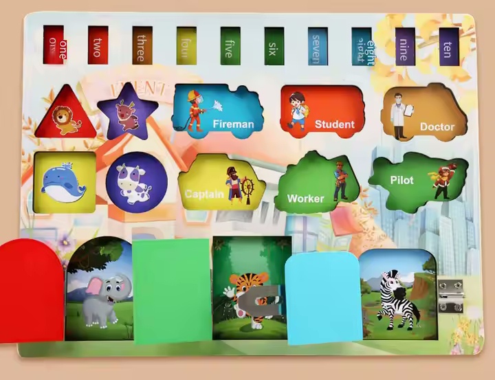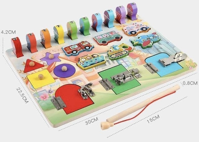 Jucându-se, copilașul tău apucă, deschide/ închide ușile și încuietoarele, rotește fidget-ul, aprinde luminițele, scoate sunete la claxon și la xilofon, desprinde magneții de la formele geometrice , desface fermoare, se privește în oglindă, simte diferite texturi, urmărește cifre, numără mărgeluțe, înoadă fundițe etc.