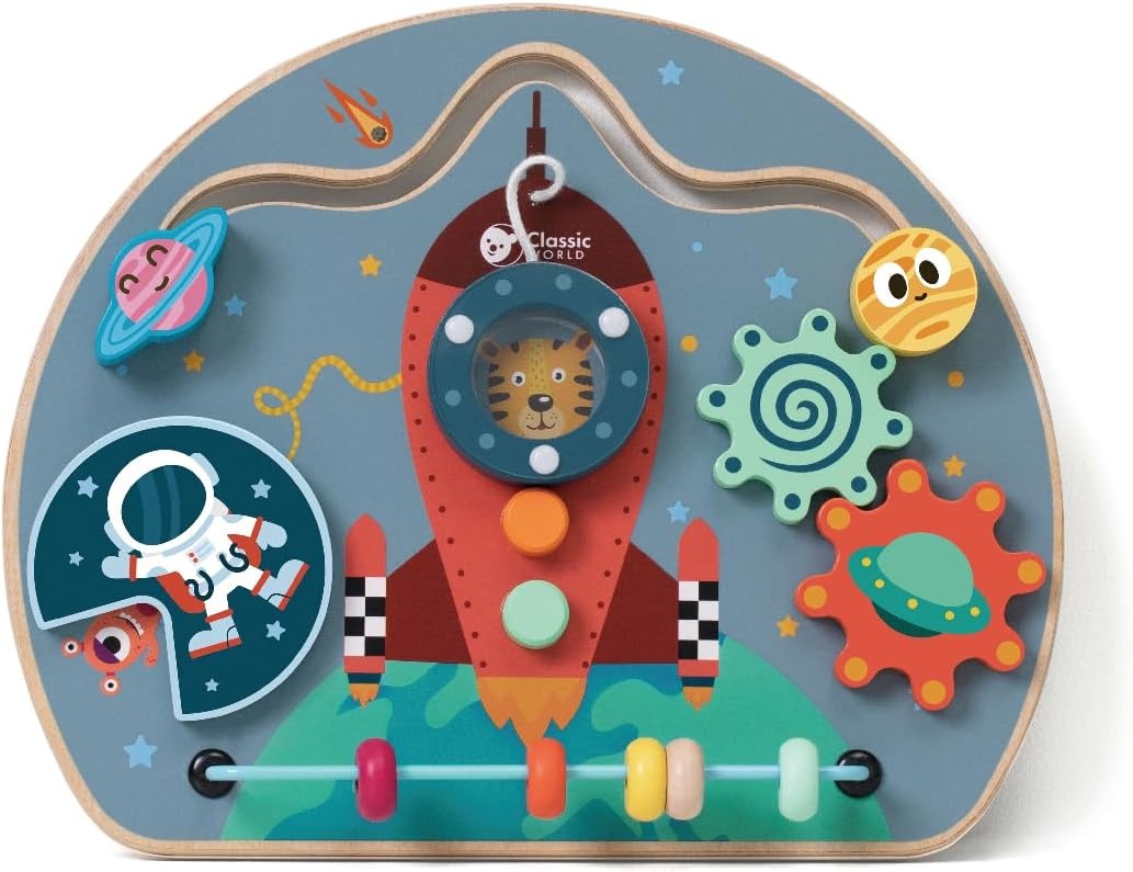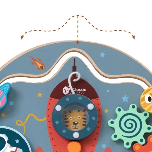 Acest busy board tematică cosmos, acesta reprezinta o racheta, include un labirint, blocuri rotative, roți dințate și un joc cu bile! Perfect pentru dezvoltarea abilităților motorii fine, coordonarea mână-ochi și dexteritatea musculară, copiii nu vor putea să-l lase din mână!