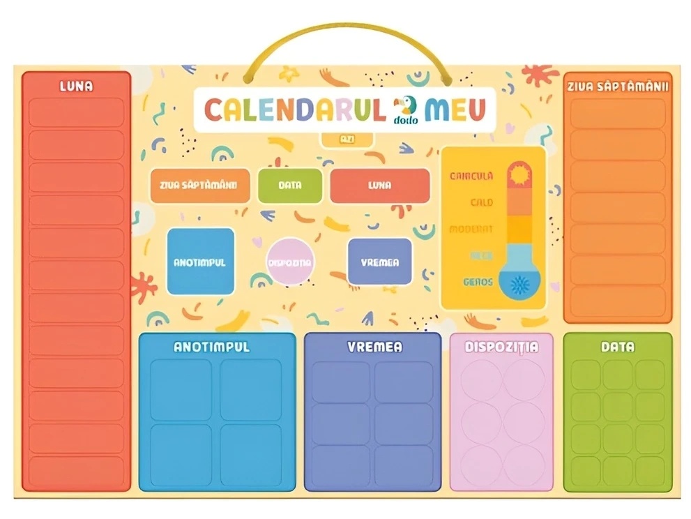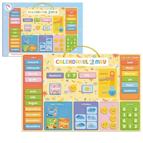 Calendarul educativ magnetic este o modalitate colorată și interactivă prin care copilul poate învăța despre timp: zilele săptămânii, lunile anului, vremea și anotimpurile.