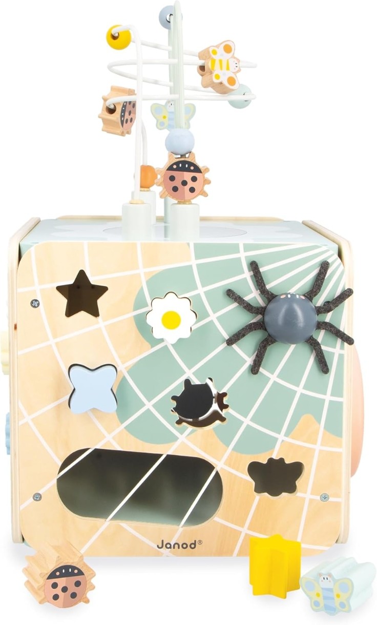 Acesta este cubul de activități din lemn pe care bebelușul sigur îl va adora! Jucăria completă pentru învățare timpurie a fost concepută pentru a stimula simțurile micuților cu vârsta de 18 luni și peste. Ce vă puteți aștepta de la această jucărie din lemn pentru copii: abilități motorii fine, stimulare sonoră, manipulare, creare de crestături și un nou prieten surprinzător. Cele 11 activități sunt distribuite pe fiecare parte, rezultând un cub gigantic multi-activități, plin de surprize, toate la îndemâna bebelușului!