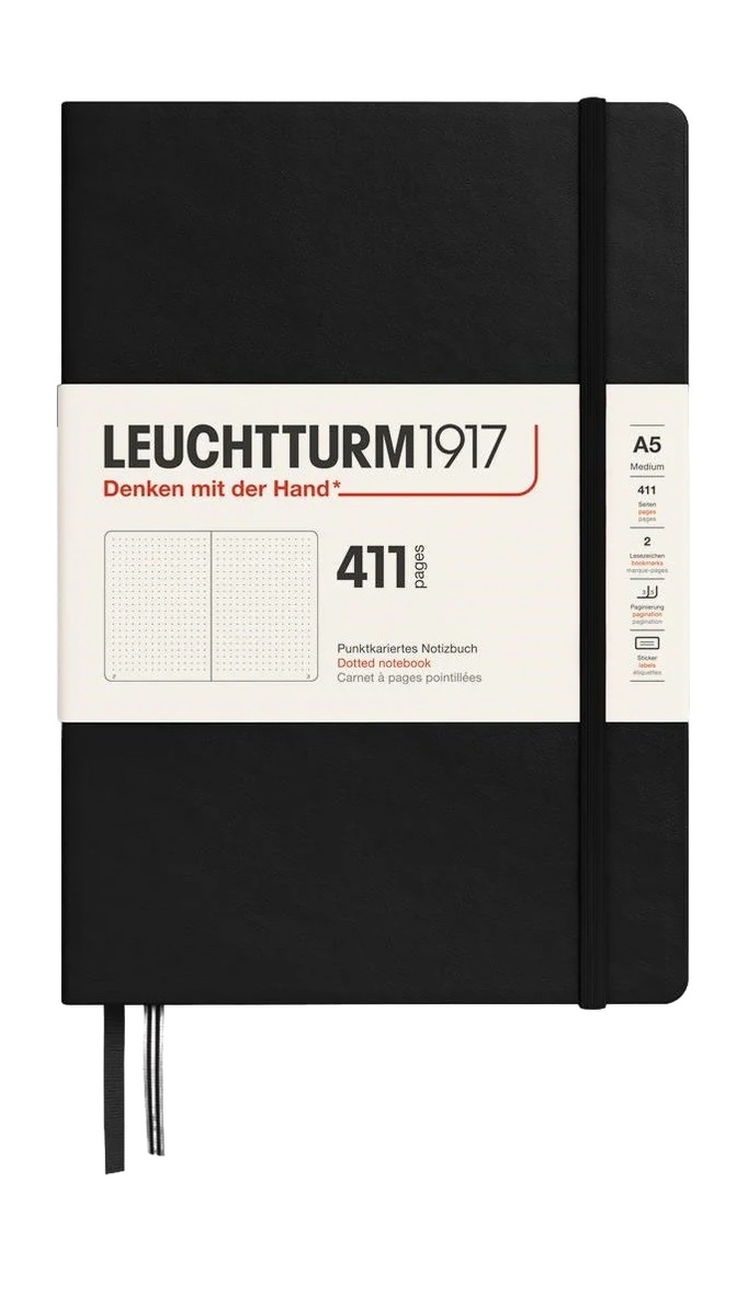 Caietul Leuchtturm format A5, de culoare neagră, conține 411 pagini numerotate, cu o greutate a hârtiei de 80 g/m².