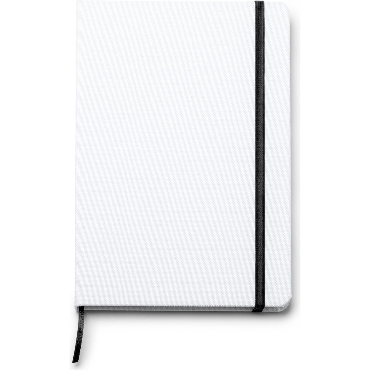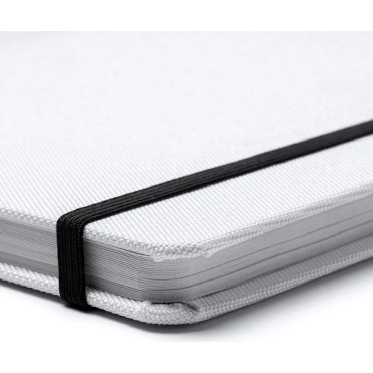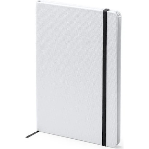 Bloc de notițe format A5, ideal pentru sublimare, cu copertă tare. Include semn de carte și bandă elastică de închidere asortată.Conține 100 de file albe.