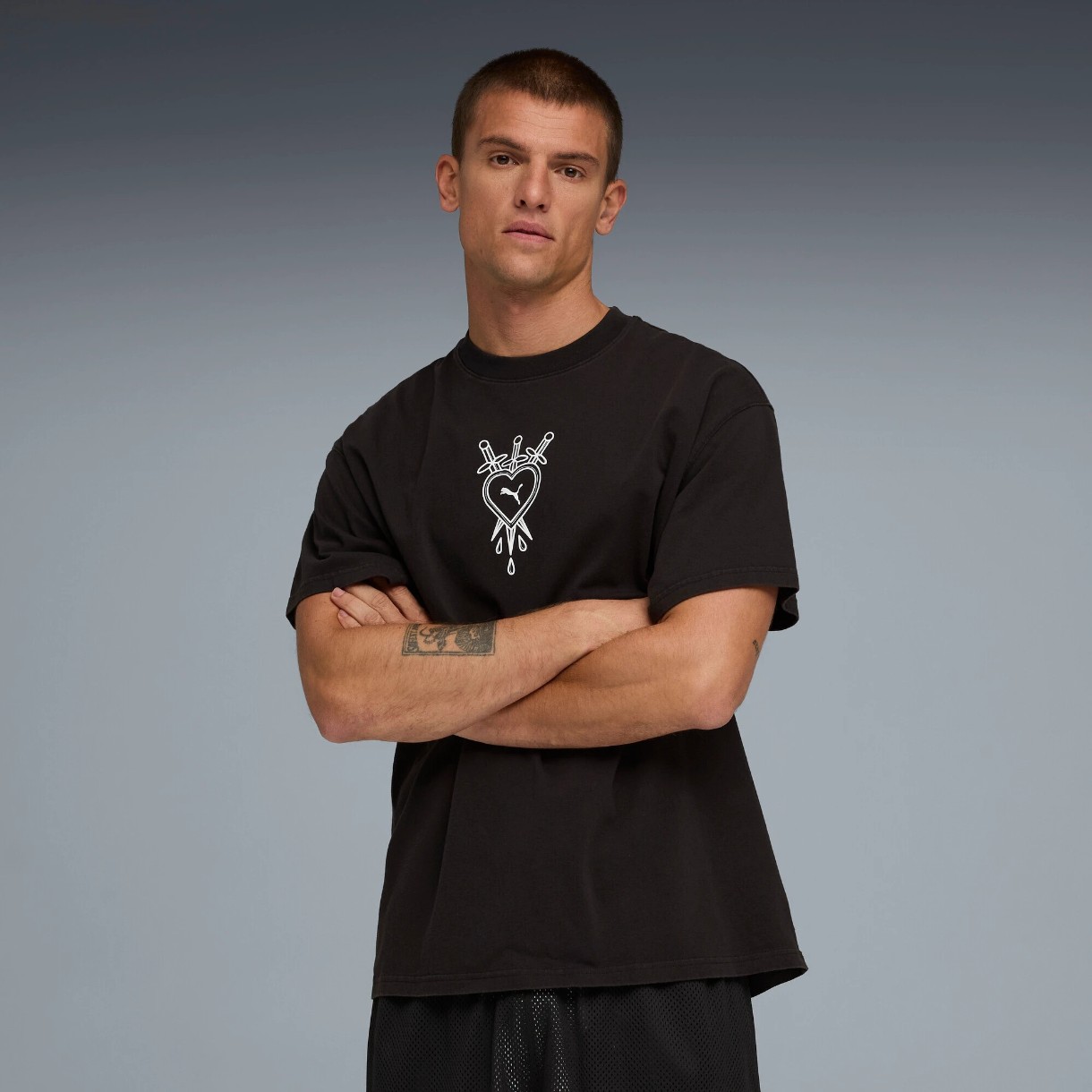 Imprimeul grafic Swish N' Ink și PUMA Cat pe piept devine elementul principal de accent, definind stilul modelului și intensificând expresivitatea vizuală. Tricoul este realizat cu cel puțin 20% bumbac reciclat, susținând o abordare mai responsabilă a producției.