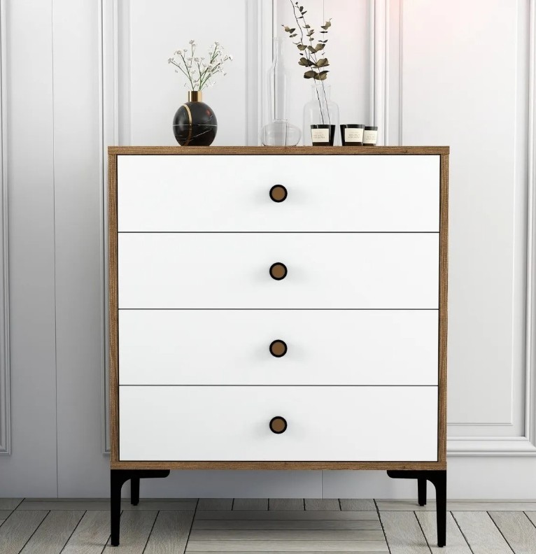 Cu patru sertare spațioase, această comodă oferă un spațiu amplu de depozitare pentru toate lucrurile tale esențiale. Fie că este vorba de haine, accesorii sau alte obiecte, puteți păstra cu ușurință totul organizat și la îndemână. Mânerele din plastic adaugă comoditate și facilitează deschiderea și închiderea sertarelor.