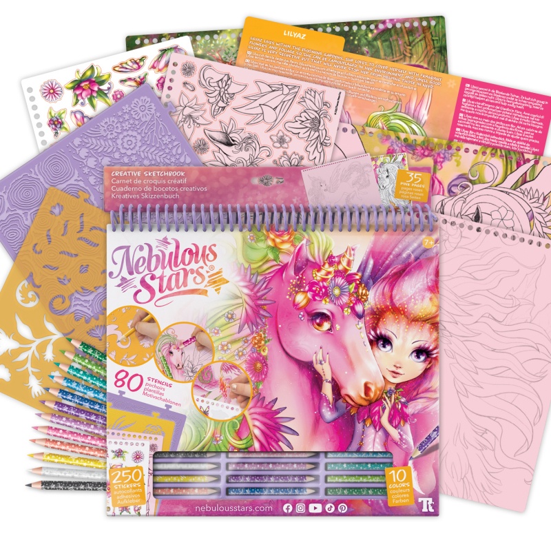 In set35 de pagini de schiță roz, 80 de șabloane, 4 modele de frecare, 250 de autocolante, 12 creioane colorate, 12 tehnici de desen, povestea unicornilor Lilyaz și Viviaz, instrucțiuni
