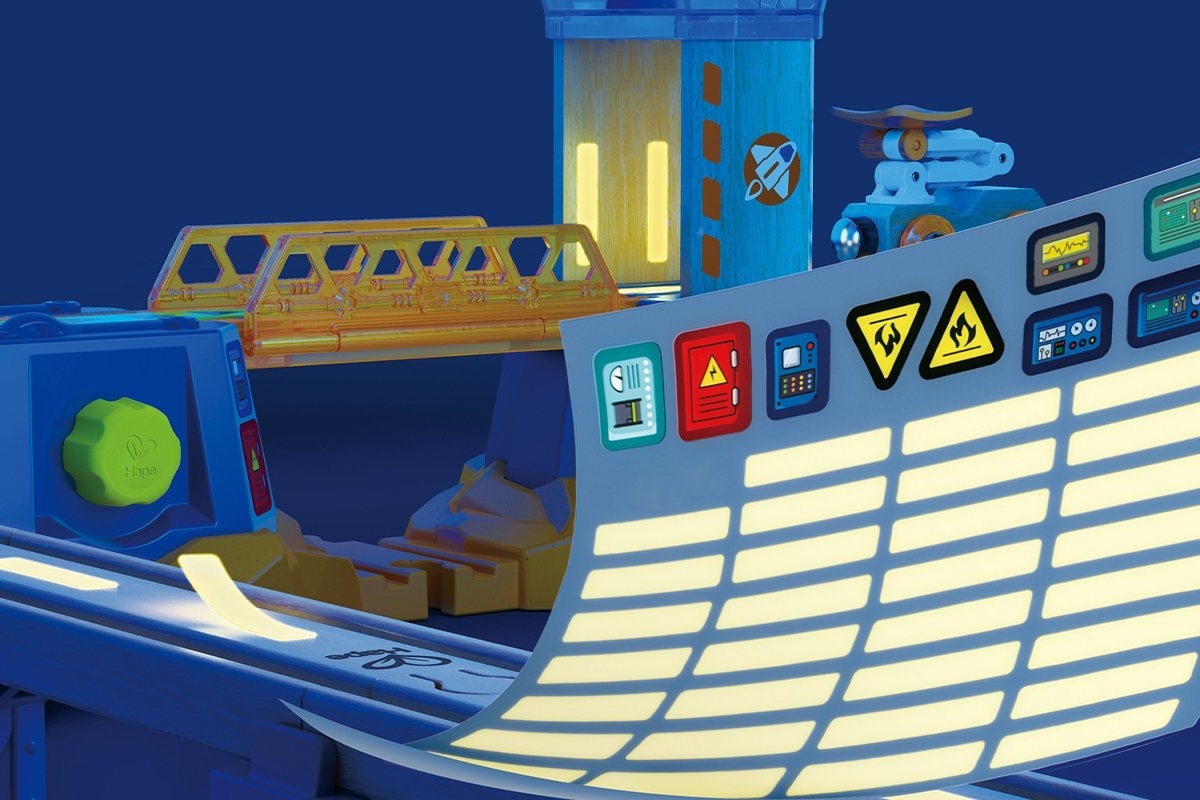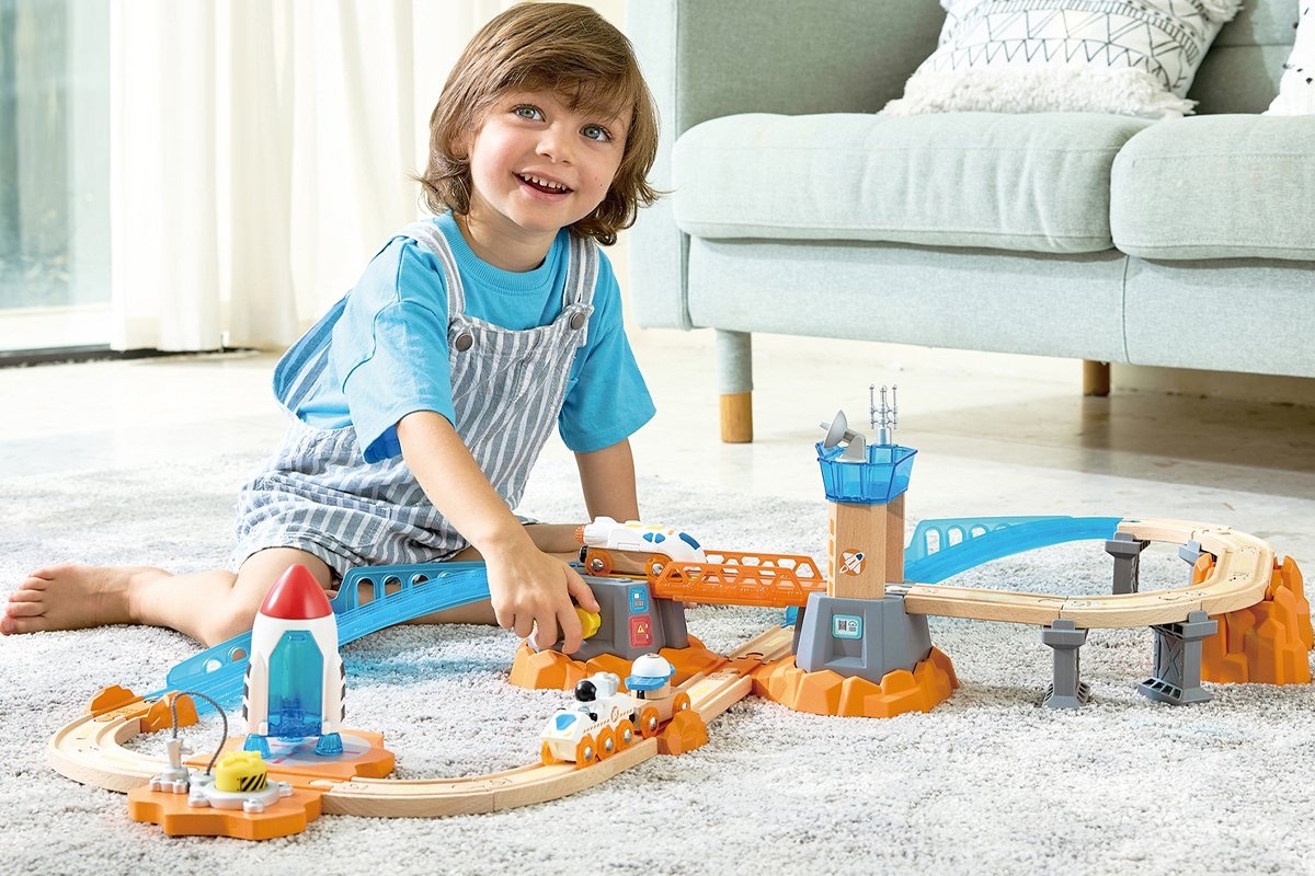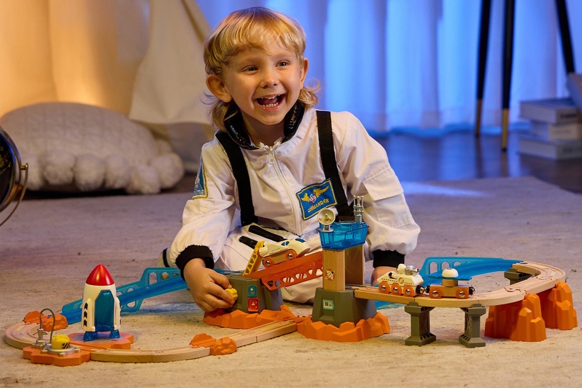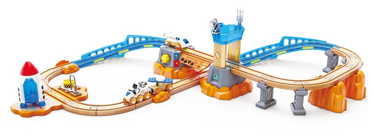 Este posibil să construiești o cale ferată din lemn pe Marte? Desigur, da! Acest set spațial cu mai multe niveluri este conceput pur și simplu pentru explorarea planetelor, galaxiilor și asteroizilor îndepărtați. Setul include mai multe vehicule diferite pentru explorarea spațiului, o cameră de control cu antene, o rampă de lansare a navetei și o rampă de lansare a rachetelor care poate deveni o benzinărie sau o stație de service în timpul jocului. Setul în sine este format din 34 de elemente, inclusiv șine din lemn și plastic de diferite forme și lungimi, o rachetă mare, o navetă spațială, un vehicul de teren cu un astronaut, o mașină cu „baterii solare” și alte accesorii. Naveta, vehiculul de teren și mașinile au magneți clasici, deci sunt compatibile nu numai între ele, ci și cu locomotivele, accesoriile și calea ferată din lemn Hape și Brio. Pentru a face jocul unic, folosește autocolantele incluse în set. Unele dintre ele chiar strălucesc în întuneric! Setul este conceput pur și simplu pentru noi descoperiri, călătorii în spațiu și explorarea universului. Jucăria este fabricată din materiale sigure, iar vopseaua este hipoalergenică.