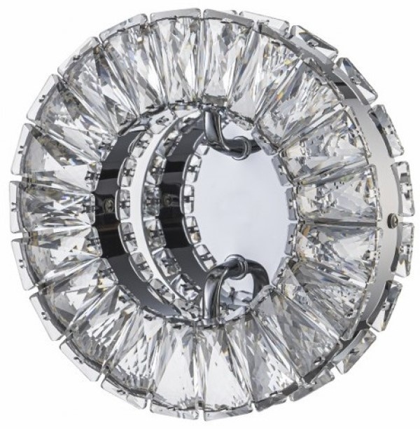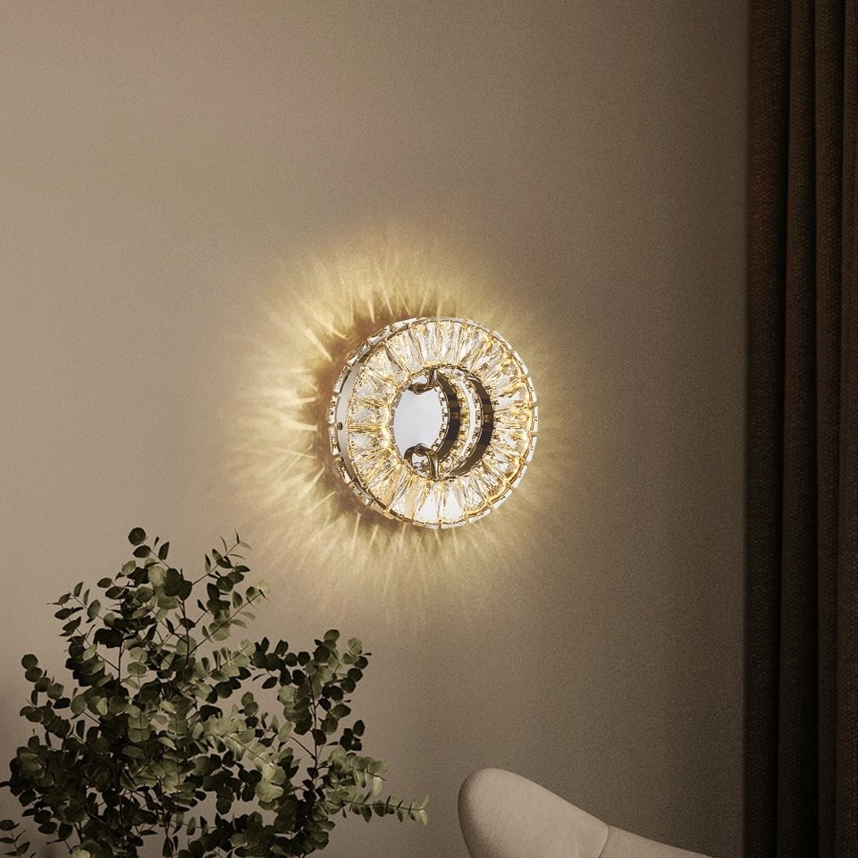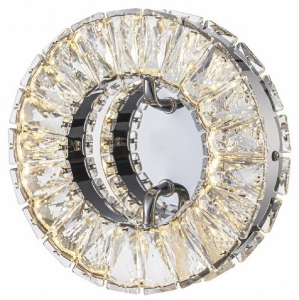 Această aplică de perete LED elegantă se remarcă printr-un design rotund cu finisaj cromat lucios, accentuat de cristale sculptate care creează un efect luminos spectaculos. Iluminarea LED integrată oferă o lumină caldă și învăluitoare, ideală pentru crearea unei atmosfere confortabile în orice încăpere.