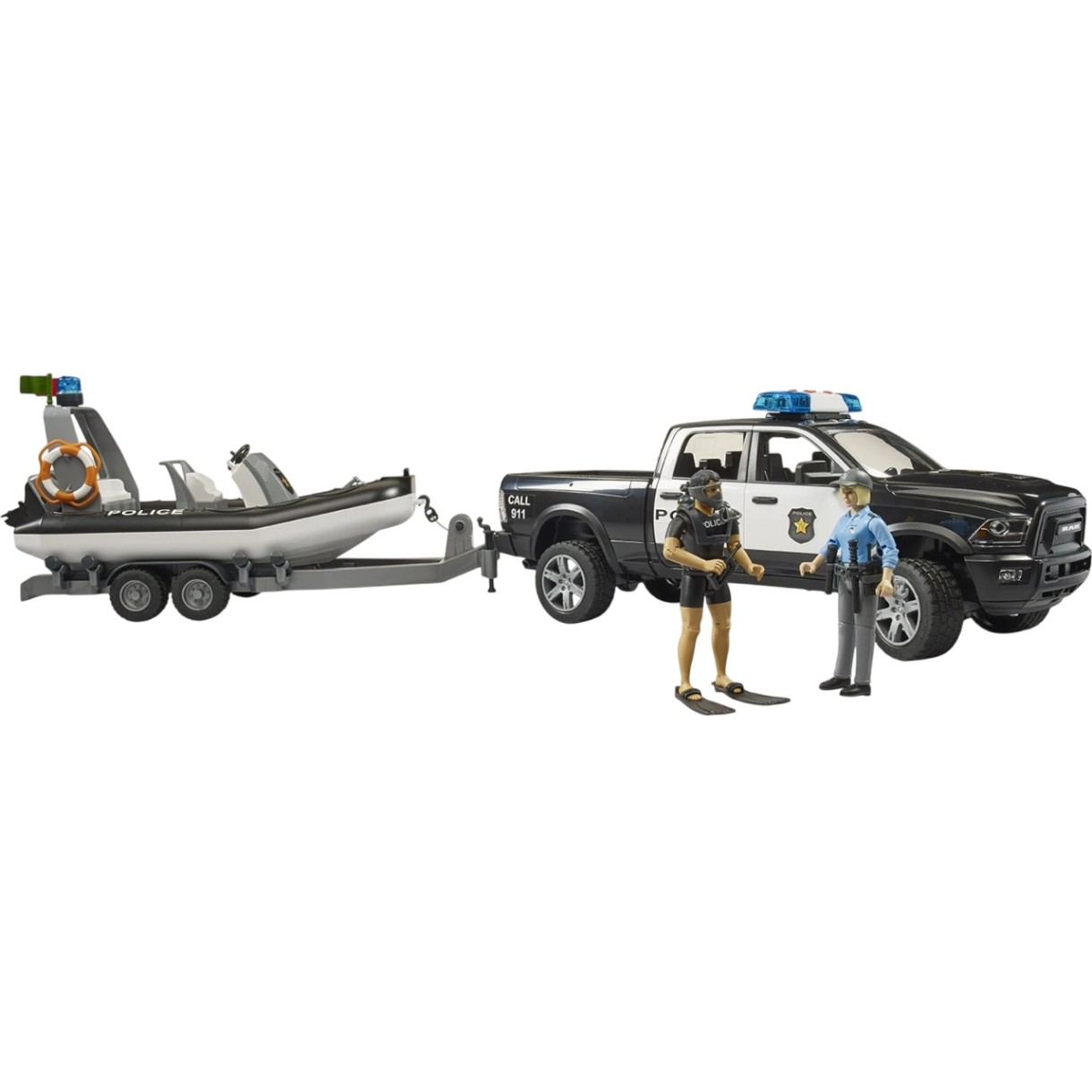 Set de mașini Bruder RAM 2500 Police Truck Boat Trailer