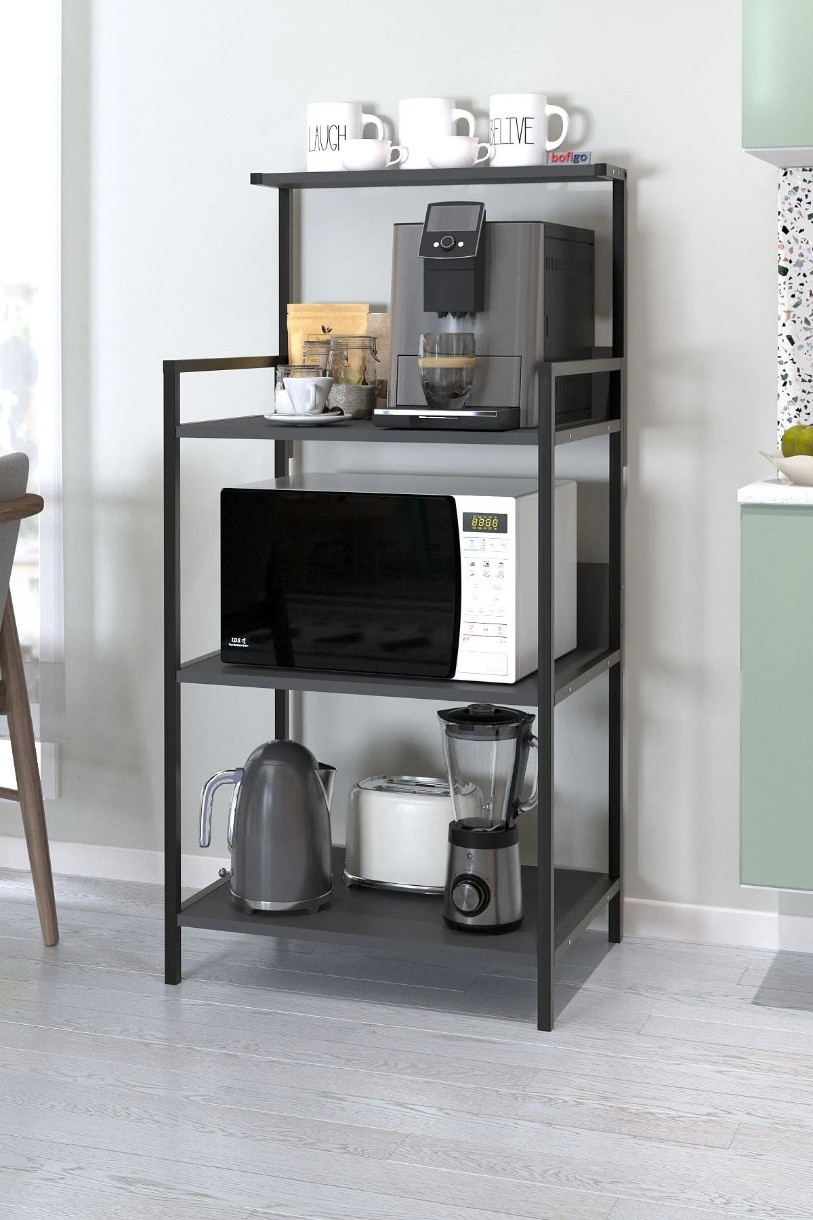 Etajeră pentru bucătărie 28-01-08 este o soluție modernă și practică pentru organizarea eficientă a spațiului. Designul multifuncțional oferă o suprafață ideală pentru espressor, cuptor cu microunde sau alte electrocasnice, împreună cu rafturi pentru depozitare.