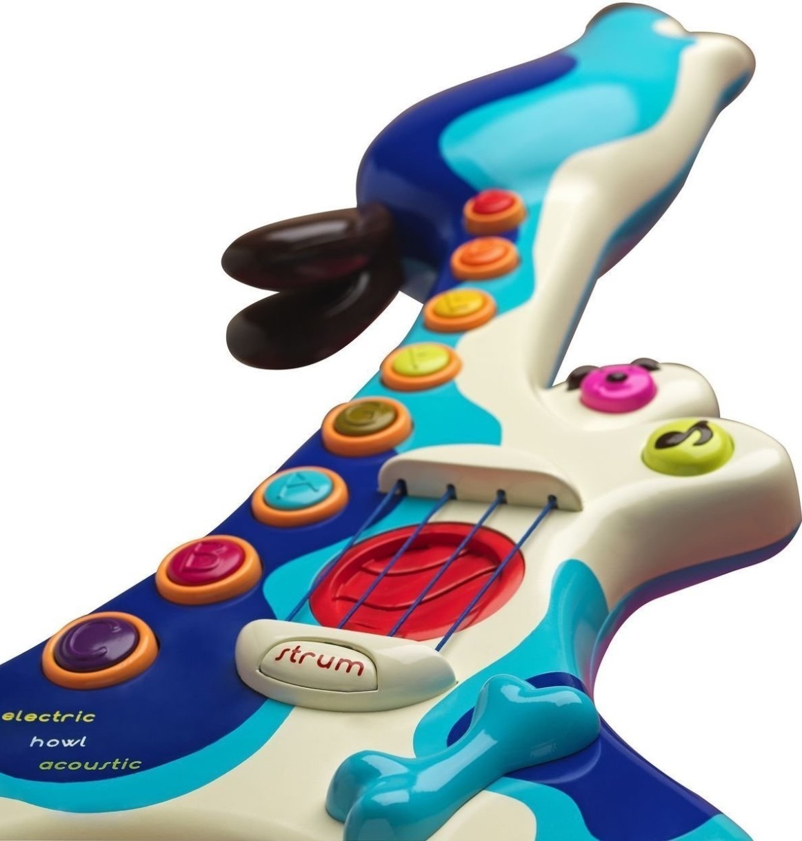 Canta cele mai deosebite acorduri de chitara cu prietenul tau credincios. Acorduri inregistrate in studiou profesional! - 3 moduri: acustica, electro si latrat. - 8 butoane muzicale cu coarde de la C la C. - Corzi de chitara care creeaza secvente de coarda sau melodii programate. - Magic Bone va adauga efecte speciale pentru oricare dintre cantecele tale. - 20 melodii si 9 cantece amuzante de caini. - Exista controlul volumului. - Se opreste automat dupa 2 minute. Cainele chitarist ii va dezvolta copilului: - auzul muzical - creativitate - imaginatie. Jucarii educationale Battat - Fii muzical. Fii distractiv. Fii tu insuti Dimensiunea jucariei este de 24x9,5x46 cm. Alimentare - 3 baterii AA incluse.