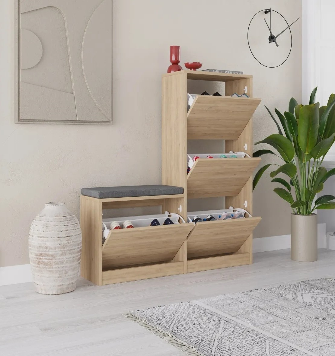 Cu dimensiunile de 105 cm lățime, 118,5 cm înălțime și 26 cm adâncime, dulapul oferă spațiu generos pentru toate perechile de pantofi. Designul inteligent include mai multe rafturi și compartimente, permițând organizarea ordonată a încălțămintei și acces facil la fiecare pereche. Găsirea pantofilor potriviți devine rapidă și ușoară.