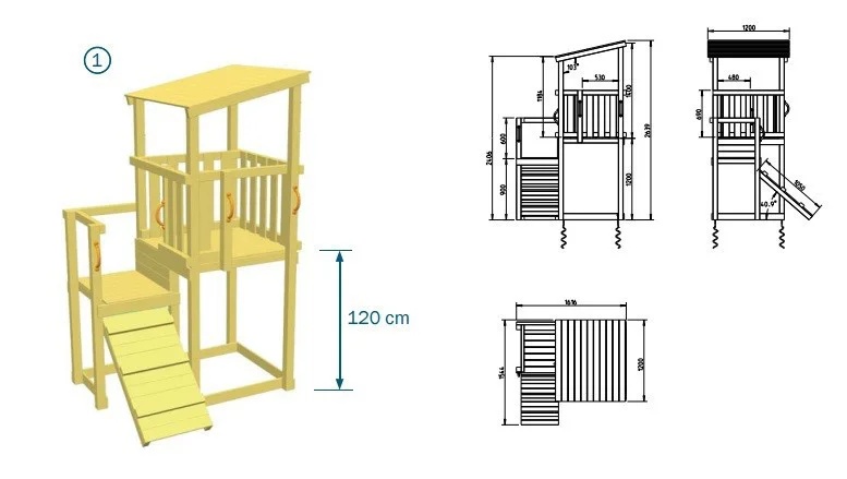 Materiale: lemnos din conifere tratat. Stâlpi ai unei case de 80mm x 80mm și 90mm x 90mm. Materialul lemnos este un material viu, care este în contact permanent și direct cu schimbările de temperatură, cu umezeală, respectiv cu razele solare. Datorită contactului permanent cu condițiile meteo din exterior, pot apare unele crăpături, fiind un fenomen natural. Acest lucru nu afectează în nici un fel durata de viață a produselor. Complexul este fixat la sol cu ajutorul ancorelor (fără betonare).