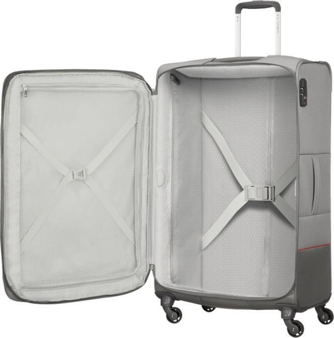 — Organizarea internă este familiară lui Samsonite, cu bretele elastice încrucișate în compartimentul principal, un buzunar lung cu fermoar și un compartiment pentru călcat pe capac, cu o plasă despărțitoare cu fermoar.