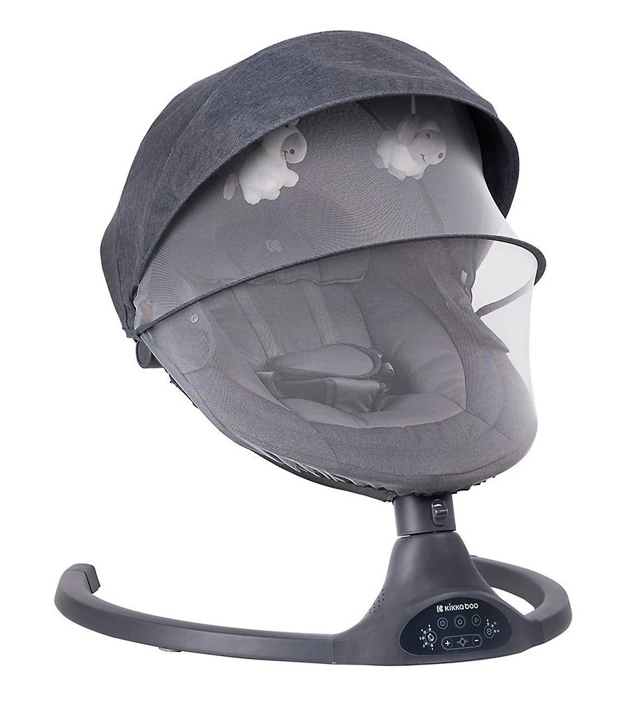 Cadru ușor din aluminiu. Balansare absolut silențioasă de la o parte la alta. Funcție de balansare cu 5 viteze. Buton de blocare a balansului. Afișaj cu ecran tactil. Panou muzical cu 10 melodii și control al volumului. Timer pentru 8, 15 și 30 de minute. Spătar reglabil. Capotă detașabilă cu plasă de țânțari și parasolar extins.