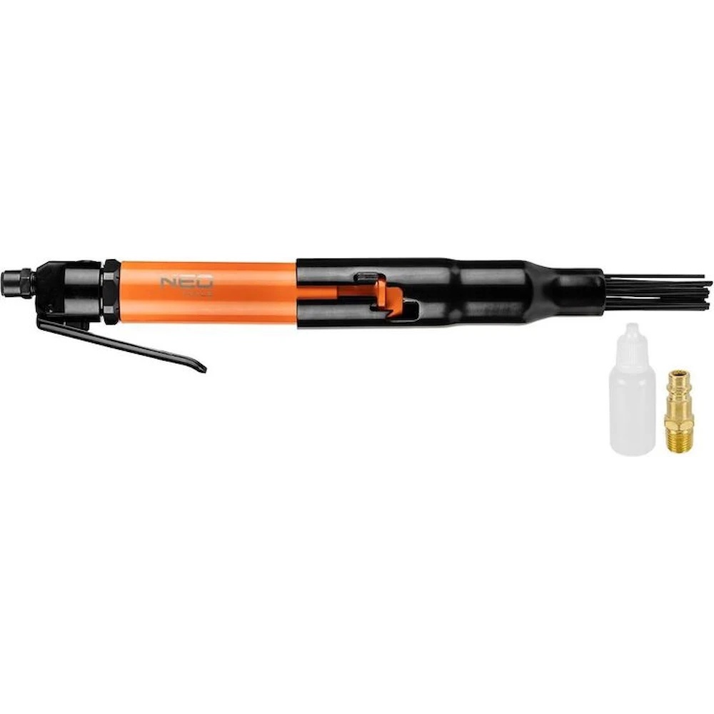 Пistolul profesional cu ciocan cu ace pentru rugină și suduri de la marca NEO este un instrument indispensabil pentru majoritatea lucrărilor de prelucrare a metalelor. Este echipat cu un set de 19 ace cu un diametru de 3 mm fiecare. Atinge o frecvență de 5.000 de lovituri pe minut și are o eficiență de 85 l/min consum de aer. Conectare ¼".