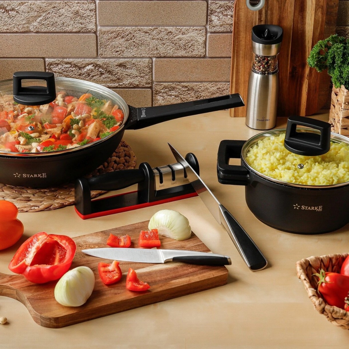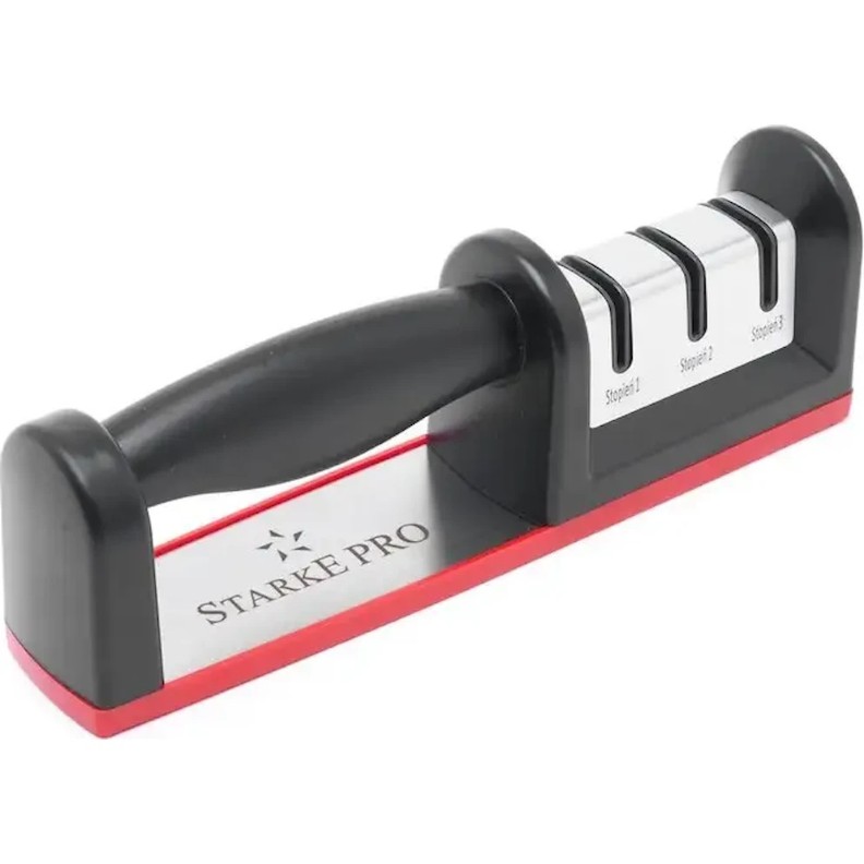 Alte beneficii ale achiziționării ascuțitorului de cuțite Starke Pro cu trei trepte sunt, de exemplu, designul atrăgător, care combină oțelul inoxidabil cu un plastic de bună calitate, precum și construcția care permite obținerea unei ascuțimi corespunzătoare prin tragerea în ambele direcții pe roțile de diamant. Este, de asemenea, ideal pentru întreținerea cuțitelor metalice (ascuțitorul de cuțite cu diamant Starke Pro va menține eficiența muchiei tăietoare pentru produse din diferite categorii de preț). Ultimul pas al ascuțirii servește la netezirea metalului astfel profilat. Toate acestea cu un efort minim depus în ascuțirea cuțitelor.