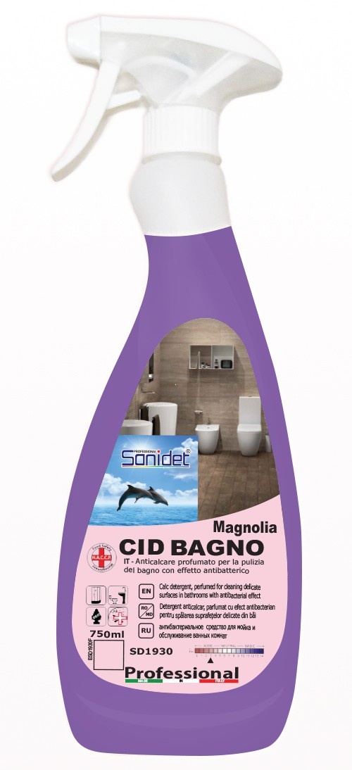 Detergent special antibacterian cu parfum de magnolie pentru indepartarea murdariei calcaroase, a urmelor de sapun si a petelor de apa, fara o frecare energica, de pe toate suprafetele si obiectele sanitare care se gasesc in bai sau grupuri sanitare. Datorita continutului de Saruri de Amoniu Quaternar garanteaza actiunea antibacteriana, igienizand suprafetele curatate. Formula sa speciala nu deterioreaza suprafetele si lasa suprafetele stralucitoare si ambientul placut parfumat pentru mult timp. Cid Bagno este recomandat pentru planul de curatenie si autocontrol H.A.C.C.P.