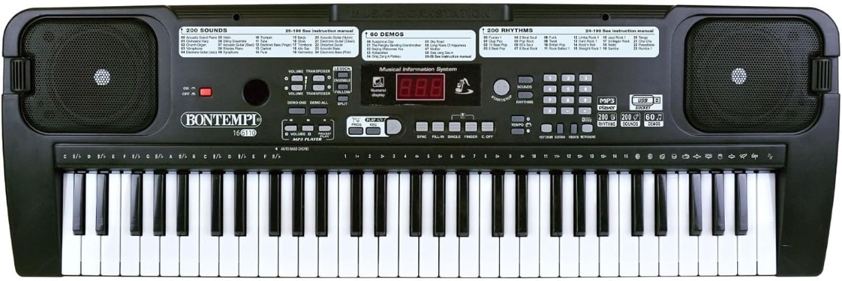 Mica tastatură digitală mini cu 61 de taste este excelentă pentru cei care nu au abilitatea sau forța degetelor necesare pentru a cânta la o claviatură de dimensiuni normale. Funcția de învățare intuitivă este susținută de 200 de stiluri de sunete și ritmuri. Ascultați și învățați în orice moment al zilei, utilizând intrarea pentru căști sau mufa directă la amplificatorul de claviatură pentru a oferi un spectacol la volum ridicat. Complet portabilă, poate fi utilizată fie de la rețea, fie cu 6 baterii AA (nu sunt incluse).
